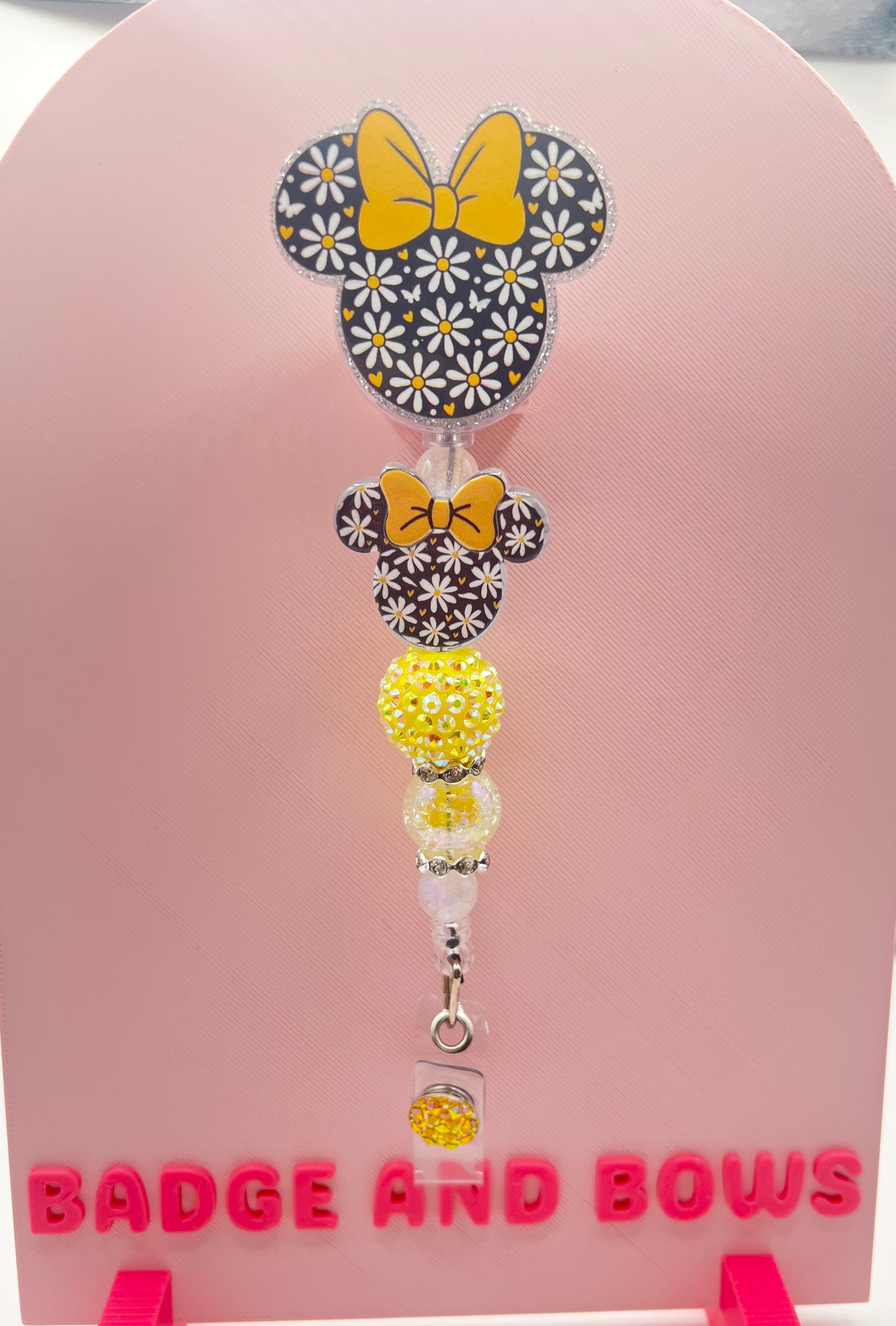 Alligator claw clip badge reels with beads.